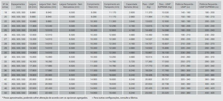 A plantadeira USAP foi desenvolvida com base na reconhecida tecnologia das linhas de plantio que vêm equipando as plantadeiras TATU MARCHESAN, testadas e amplamente utilizadas no plantio direto. USAP SUPREMA: Equipada com distribuidores de semente à vácuo. USAP CSC: Equipada com caixa de semente central, proporcionando maior autonomia e facilidade no abastecimento de sementes. USAP ADUBO E SEMENTE: Distribuição de adubo e semente. Disponível até 30 linhas.